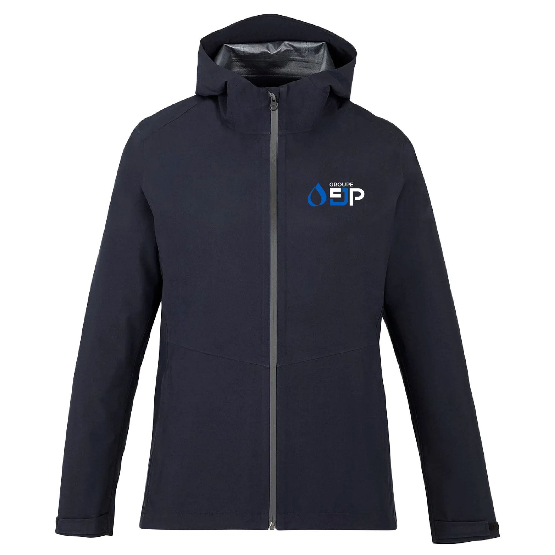 145 g/m2 “ 4.3 oz./yd2 “ 7 oz./vg lin. 100 % polyester recyclé étiré mécaniquement, imperméabilité de 5000 mm; respirabilité 1500 g/m2 résistant aux vent et fini hydrofuge. Coutures entièrement étanches. Cordon de serrage au capuchon et à la taille. Glissière YKK étanche à l'avant, poches à glissières. Non-doublé.